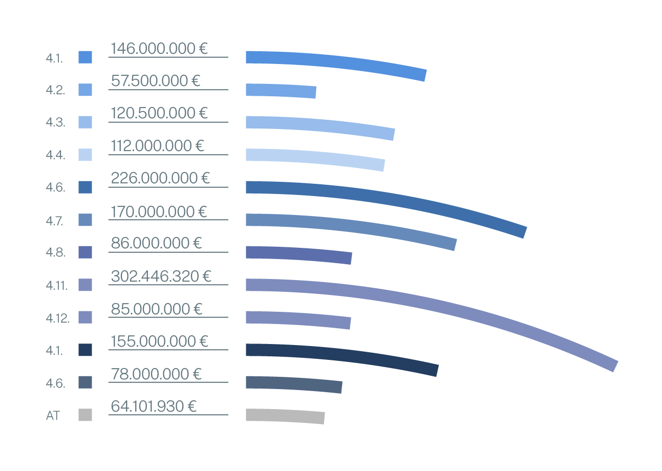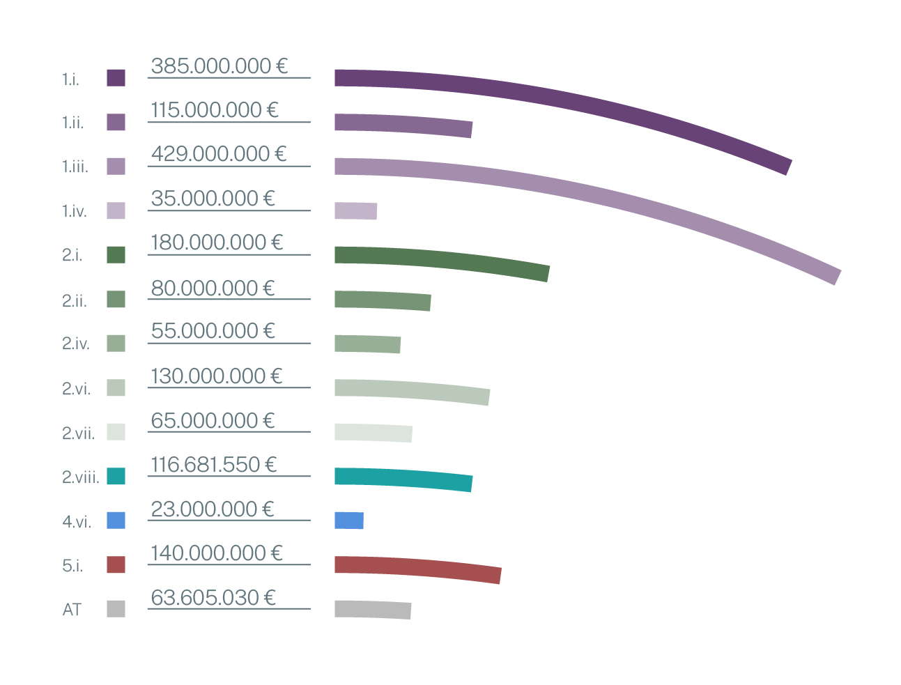 * Gesamtmittel (EU-Beitrag + nationaler Beitrag). Die Aufteilung nach spezifischen Zielen und Interventionsbereichen ist indikativ (sie spiegelt proportional die Aufteilung des EU-Beitrags gemäß dem operationellen Programm wider). Geringe Abweichungen sind aufgrund von Rundungen möglich.
