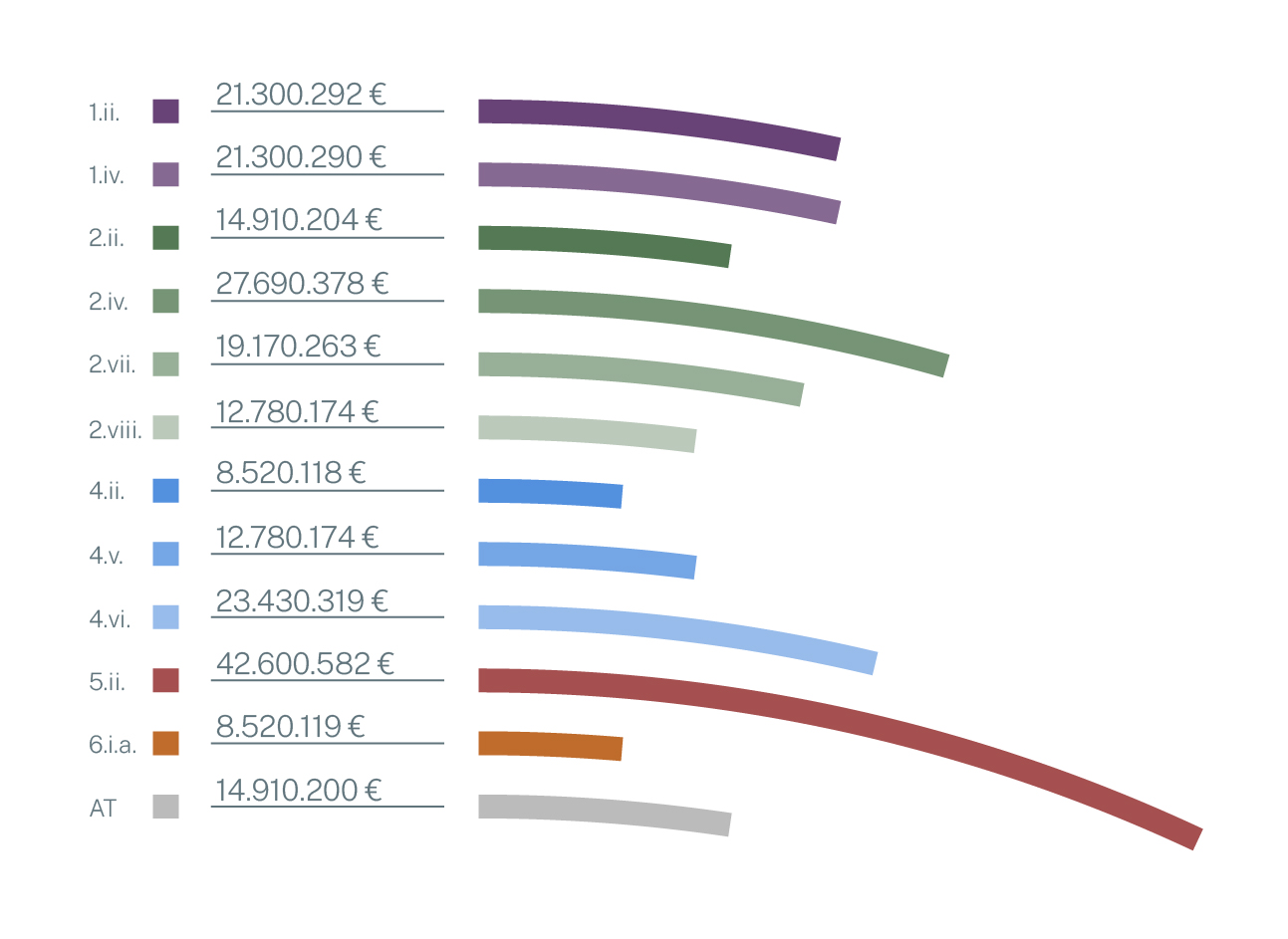 * Risorse totali (contributo dell’UE + contributo nazionale). L’allocazione per obiettivo specifico e settore d’intervento è indicativa (riprende proporzionalmente l’allocazione data dal PCT sul contributo dell’UE). Sono possibili piccole discrepanze dovute ad arrotondamenti.