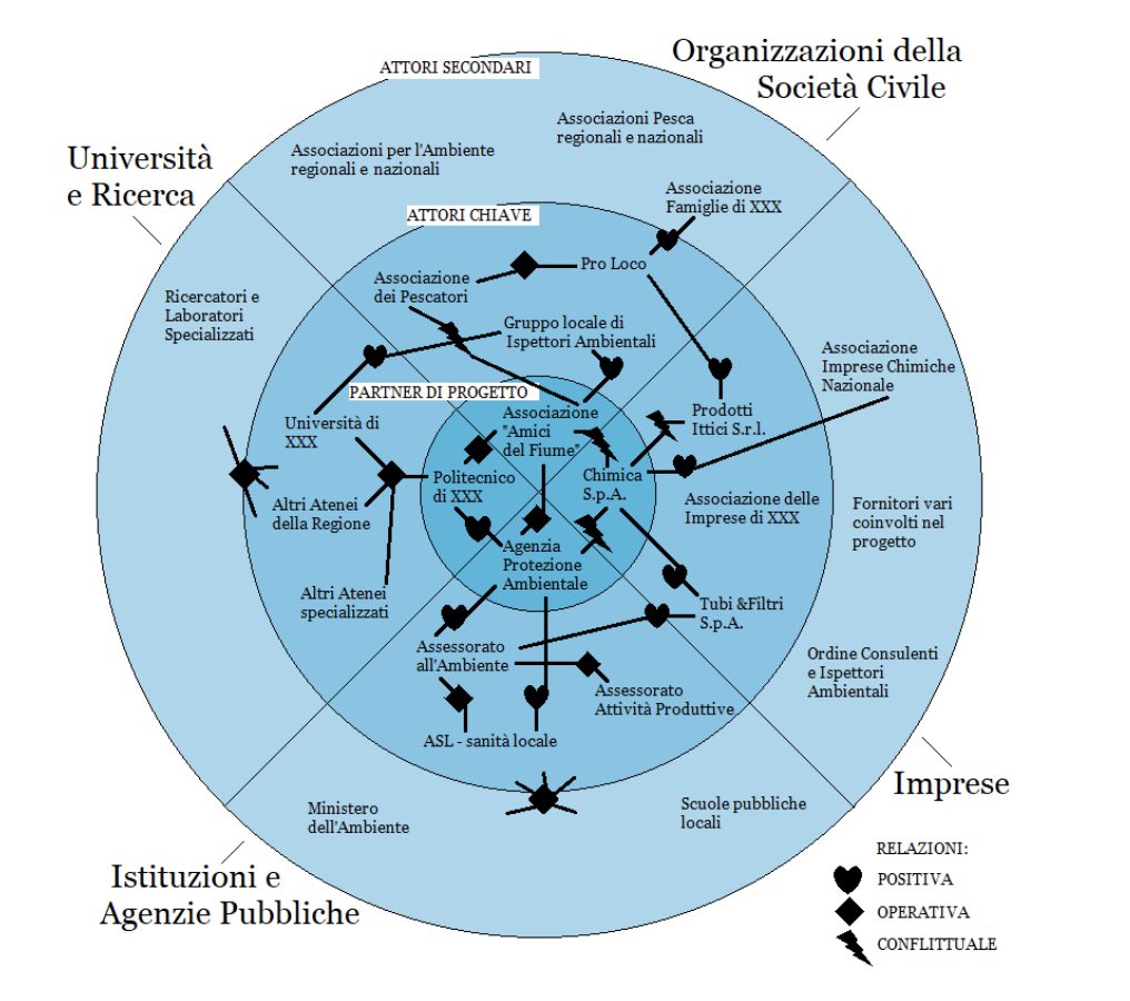 Per rappresentare visivamente la varietà di attori attivi su un progetto, la loro appartenenza e la natura delle loro relazioni viene utilizzato uno specifico diagramma circolare, detto “a occhio di bue”.